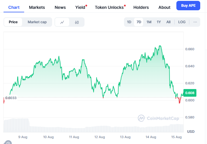 influential Bored Ape Yacht Club ecosystem and a dedicated community. Its current price of $0.6087, along with a Cryptocurrency enthusiasts often ponder: Is Apecoin a safe investment or a risky venture? As of August 2025, Apecoin (APE) is trading at $0.6087, with a 24-hour trading volume of approximately $58 million. Over the past week, the coin has experienced a modest 1.63% increase in value.
