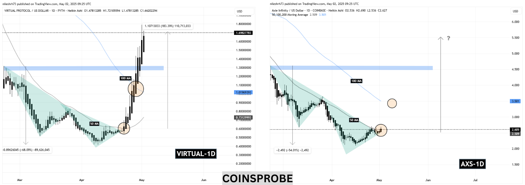 Now, take a closer look at Axie Infinity (AXS) on the right. The structure is strikingly similar. AXS dropped 54%, hitting a low of $2.09 on April 16. Since then, it has reclaimed the 50-day MA and is now beginning to approach the 100-day MA—a critical technical level that previously acted as resistance for VIRTUAL before its breakout.