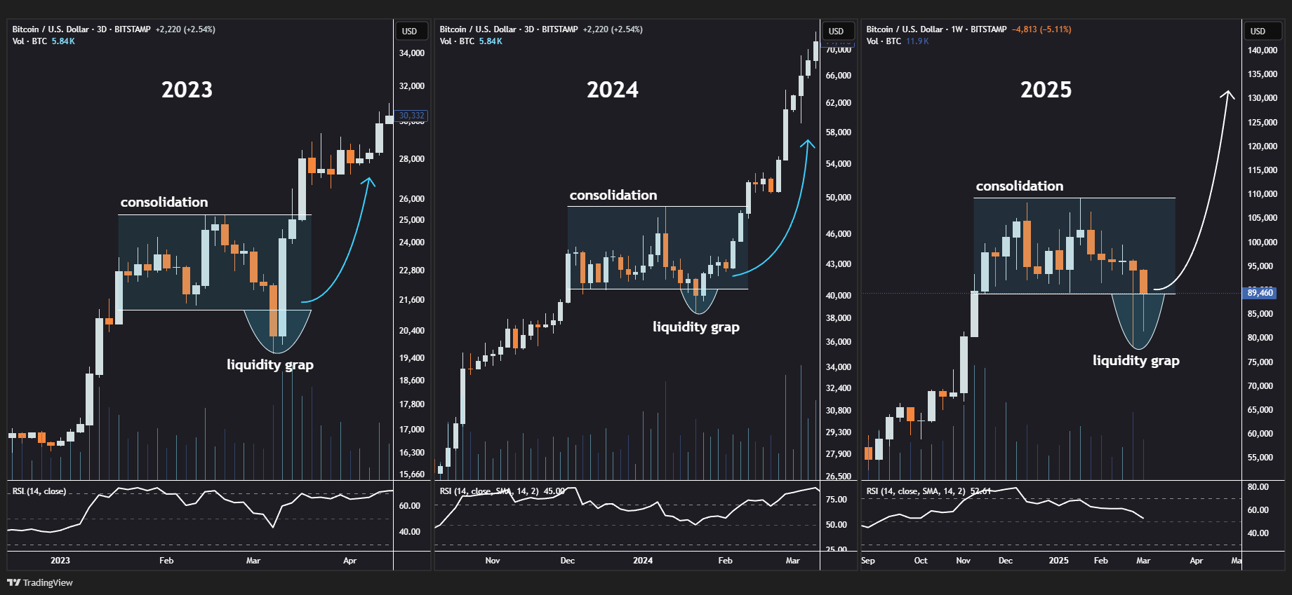 • Consolidation: A period of sideways movement where BTC accumulates strength.