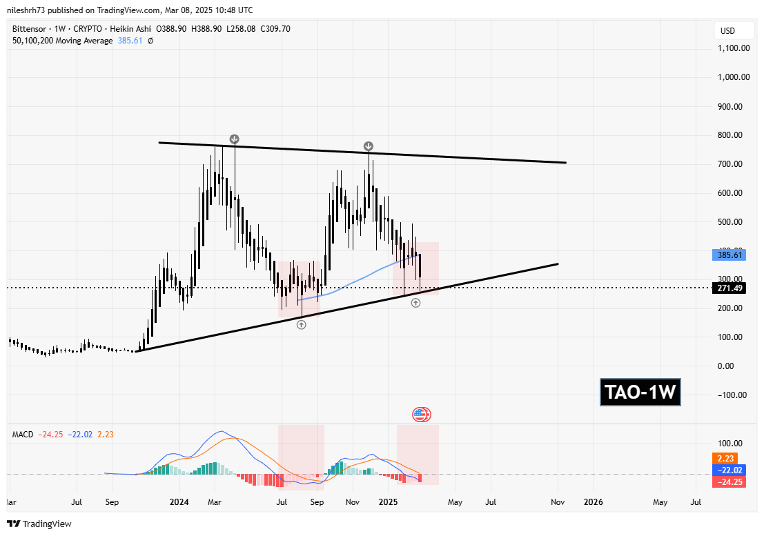 The weekly chart shows that TAO has been consolidating within a long-term symmetrical triangle pattern. The latest correction, which started on December 2, 2024, after TAO was rejected from the upper resistance of the triangle at $744, has now pushed TAO down to retest its support at $258, from where it has made a slight bounce.
