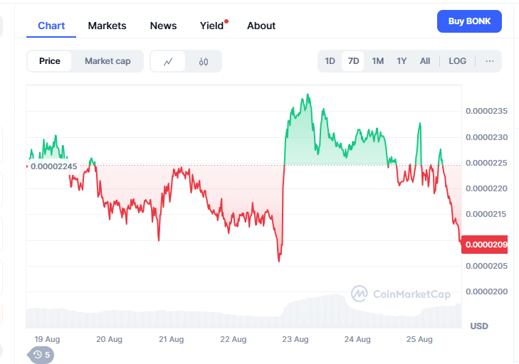 As of August 25, 2025, Bonk’s price stands at $0.0000209 USD, with a 24-hour trading volume of approximately $349 million. Over the past week, the coin has experienced a 6.77% decrease in value, reflecting the volatile nature of meme coins. Despite its current downturn, Bonk’s historical performance showcases significant surges, indicating its potential for future rallies.