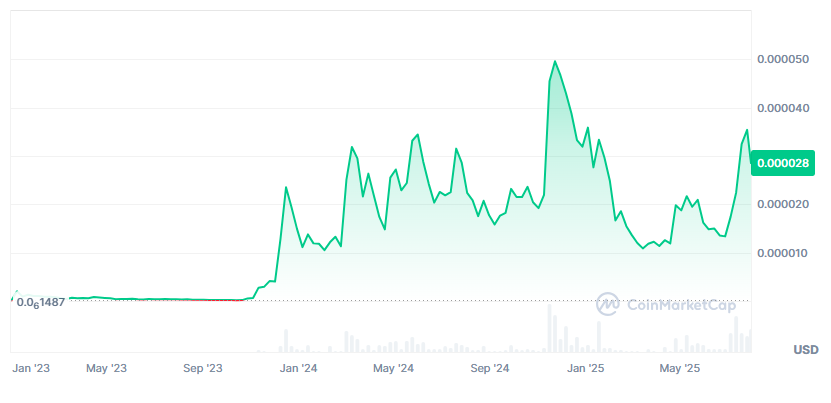 Bonk came in hot—and loud. It was the bark heard ‘round the blockchain, giving Solana a meme face at a time when DOGE and SHIB were dominating headlines. Launched as a joke with bite, BONK clawed its way from dust to dominance, hitting an all-time high of $0.00005916 in November 2024. The growth story? Off the charts: a 25,810% all-time increase from its lowest dip.