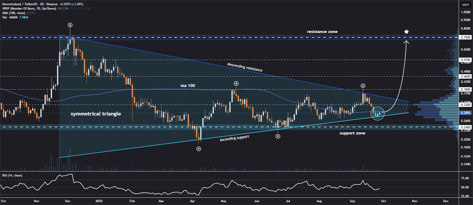 If MANA manages to defend the ascending support trendline and secure a close above the 100-day MA, the next logical target would be the triangle’s descending resistance trendline. A confirmed breakout above that level could unlock further upside potential, with price targets seen at $0.46, $0.57, and $0.76 in the medium term.