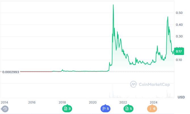 With a current price of $0.1734 and a massive market cap of $25.88 billion, Dogecoin remains the top dog in the meme coin kennel. Despite a 3.18% dip over the past week, DOGE has surged 26.40% in the past month—a sign of renewed interest and momentum. Historically, Dogecoin has shown an astronomical all-time gain of 30,979.42% since its ATL of $0.00008547 in May 2015. And though it hasn’t sniffed its ATH of $0.7376 since May 2021, recent volume surges ($828.75M in 24 hours) suggest something’s stirring.