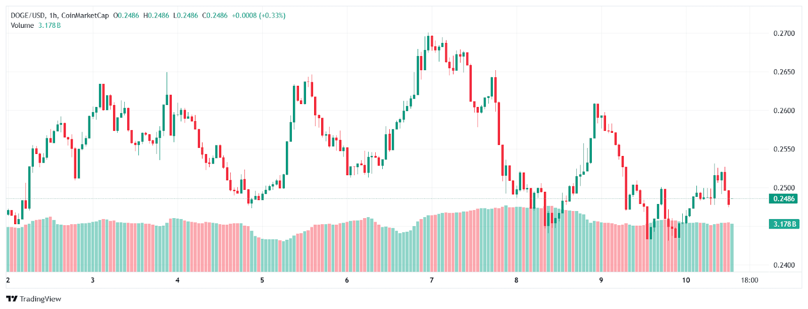 Dogecoin price today is $0.248843, showing a mild gain of +1.72% in the past day. Trading volumes remain high at 3.178 billion, confirming DOGE’s status as one of the most liquid meme coins. Technical charts show fluctuations between $0.24 and $0.26 this week, yet sentiment is firmly bullish. Nearly half of participants rated the outlook as “very bullish” for Q4 2025.