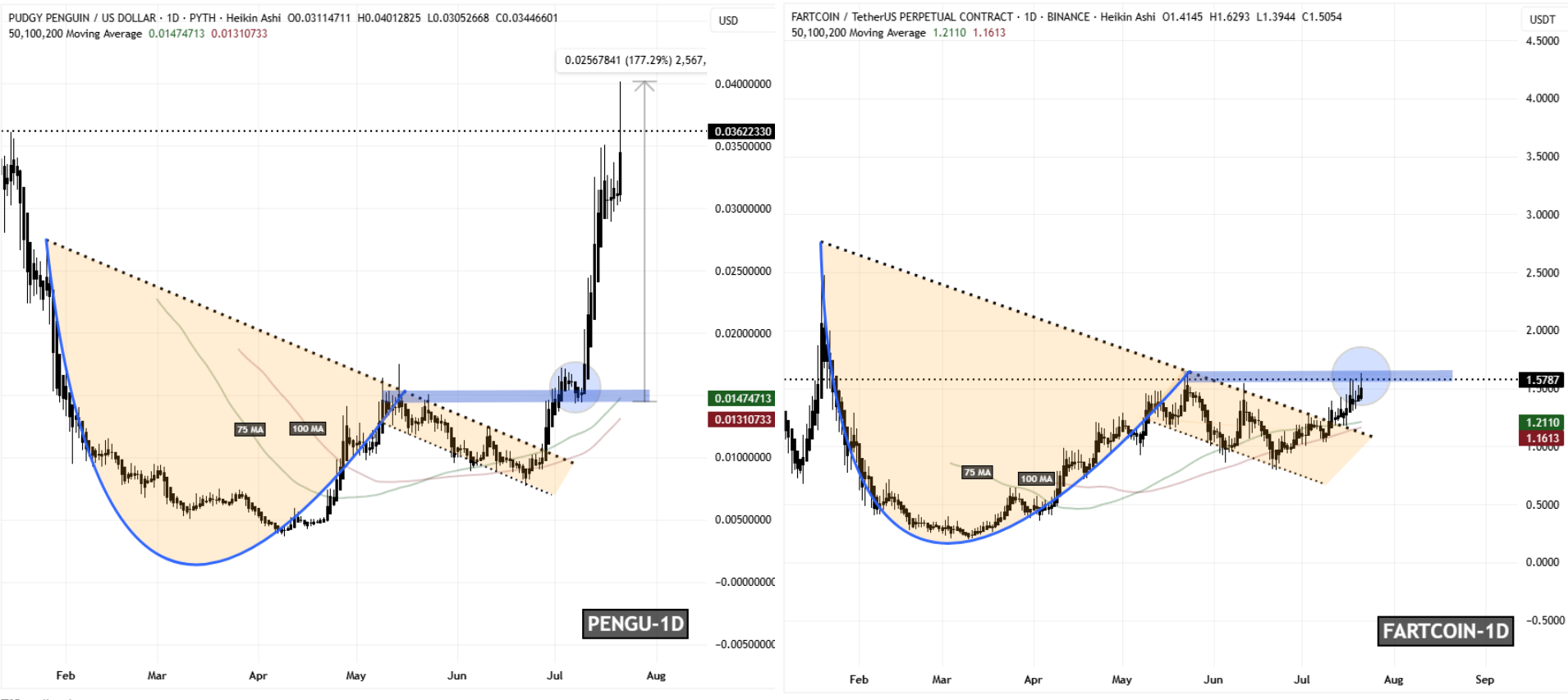 FARTCOIN is now tracing an almost identical structure. The memecoin is pressing against its key resistance zone between $1.54 and $1.65, the same type of level PENGU broke through before its sharp rally. Like PENGU, FARTCOIN has also flipped its moving averages into support, creating a foundation for potential upside.