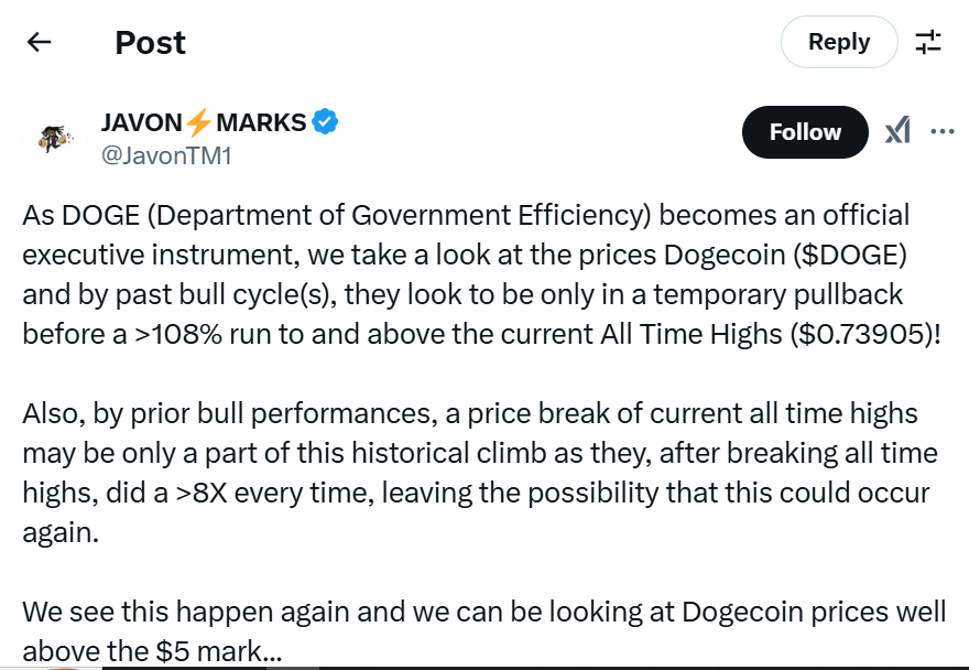 Recent Dogecoin bullish momentum has led to varied predictions from analysts. In a fresh X post, crypto analyst Javon Marks outlined a significant ascent for DOGE, positing it could surpass its highest mark of $0.73905 and climb to $5. Marks’ evaluation is supported by historical patterns where DOGE has consistently soared by over 8X after surpassing previous peaks, backed by Fibonacci extension levels that suggest considerable growth potential.