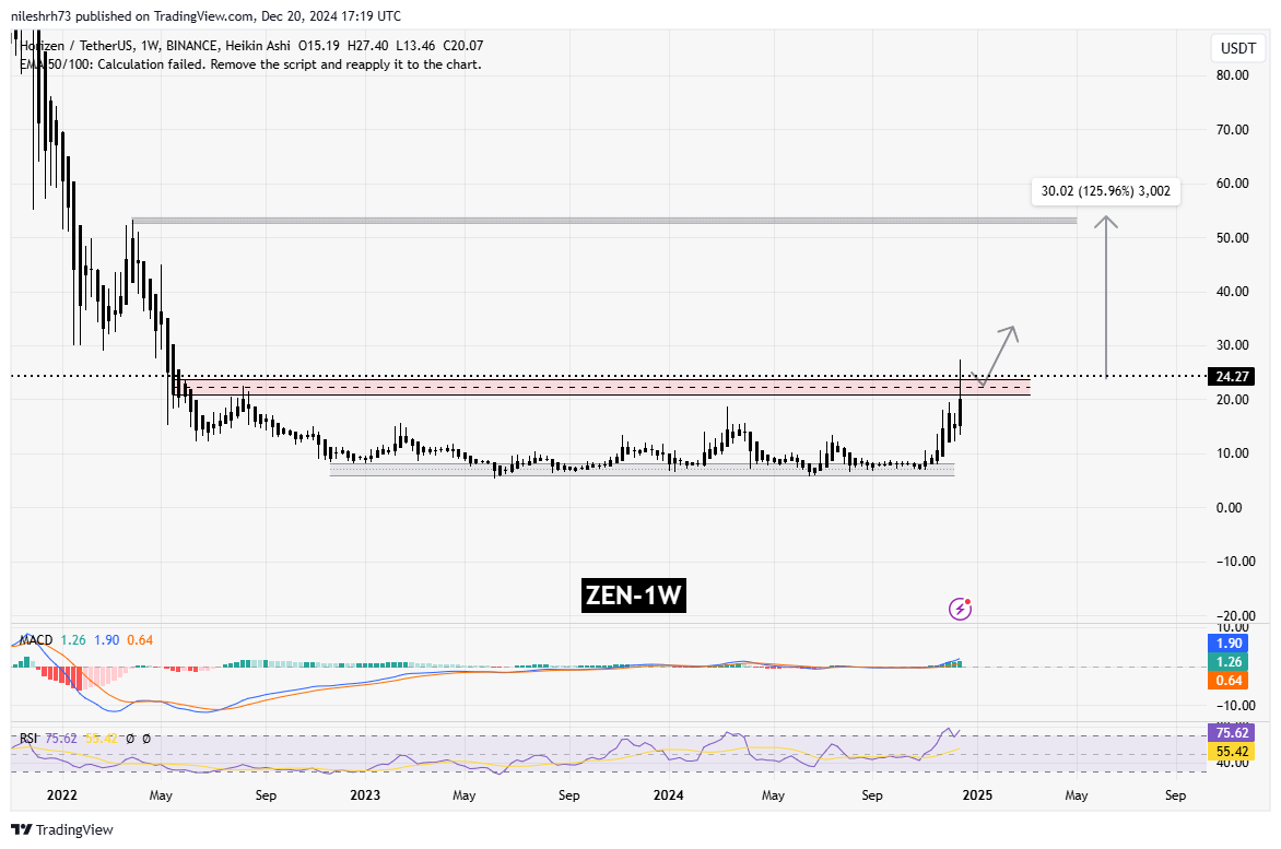 Since the Grayscale trust launch, ZEN has been riding a bullish wave, surging by nearly 70% from a low of $15 to its todays high of of $27.40. Following today’s impressive 50% rally, ZEN has successfully broken out of a key resistance zone at $22.32 and is now trading above it at $24.27.