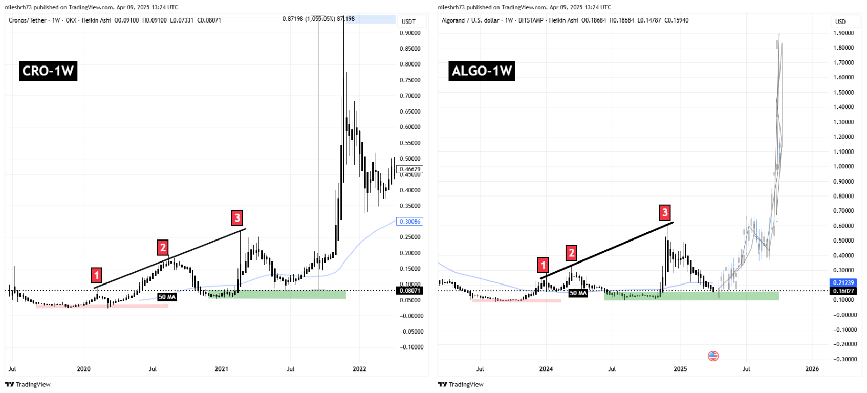 Among those hit hard is Algorand (ALGO), which has shaded half of its value since the start of 2025. But something interesting is starting to unfold — ALGO’s current price action is beginning to resemble a familiar pattern that played out in Cronos (CRO) just before its explosive rally back in 2021.