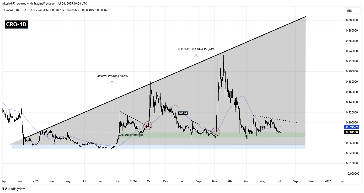 Since late 2023, CRO has respected a broad green accumulation zone roughly between $0.071 and $0.081. Each time price revisited this zone, it attracted strong buying interest, leading to significant rallies. The first such move occurred in early November 2023, resulting in nearly a 97% gain. A similar breakout followed in November 2024, delivering an even more explosive 184% upside move. These historical surges followed a familiar sequence: extended sideways price action, followed by a breakout above a descending resistance trendline, and then a clean break and hold above the 100-day moving average.
