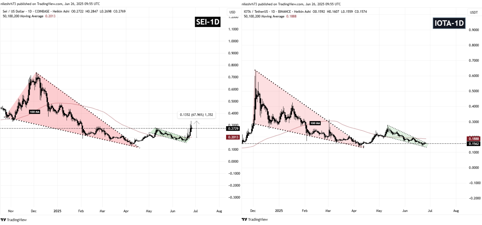 The side-by-side comparison of SEI and IOTA on the daily chart highlights a striking similarity.