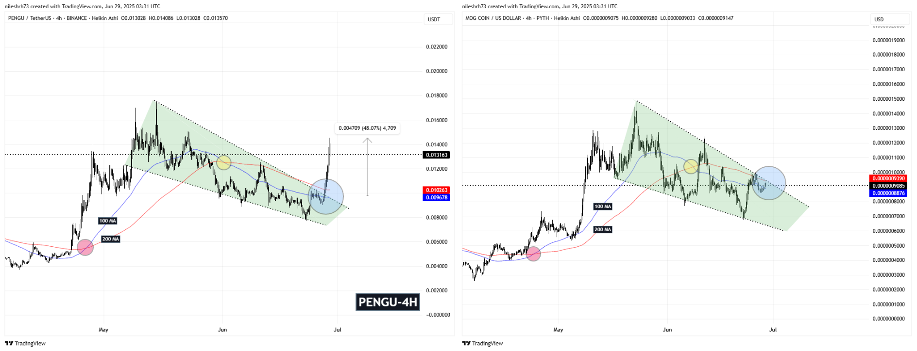 A side-by-side comparison on the 4-hour chart reveals a striking similarity between PENGU’s recent breakout rally and MOG’s current setup.