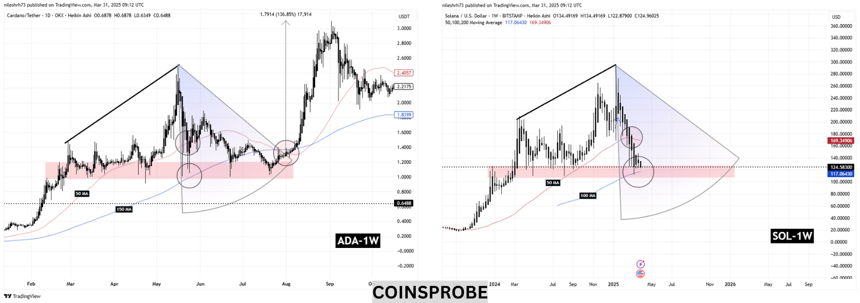 A similar setup is now visible in Solana’s price chart. After a major run-up, SOL experienced a sharp decline of same 60%, breaking below its ascending wedge and retracing to a significant support region. Just like ADA in 2021, SOL has now settled around a key accumulation zone, coinciding with the 100-day moving average. Both assets faced resistance at their respective 50-day moving averages during the recovery phase, indicating a period of consolidation before an impulsive move.