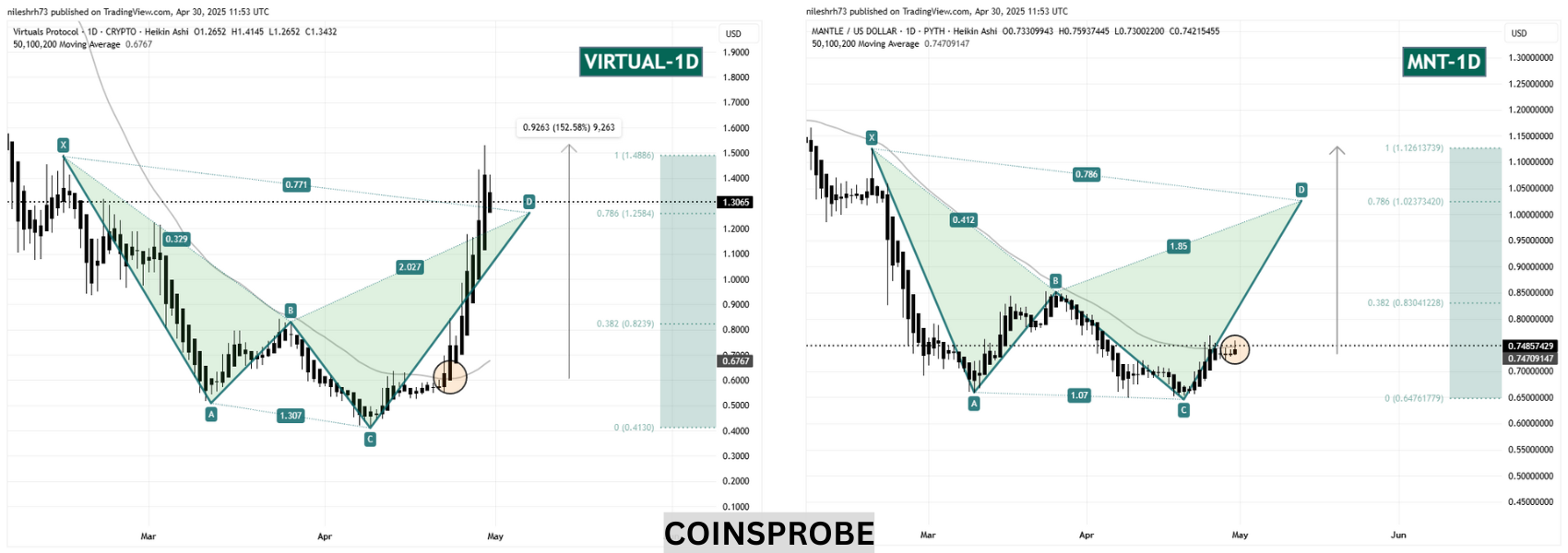 On the right side of the chart, MNT appears to be closely mimicking the same harmonic fractal. The token has just broken above its 50-day MA and is now trading near $0.7490—almost identical to where VIRTUAL was before its strong breakout.