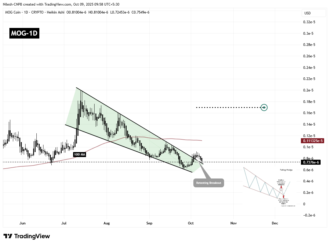 Over the past several weeks, MOG has been consolidating inside a falling wedge — a well-known bullish reversal pattern that often signals the end of a downtrend. The coin found solid footing near $0.00000061, where buyers began accumulating and pushing prices higher.