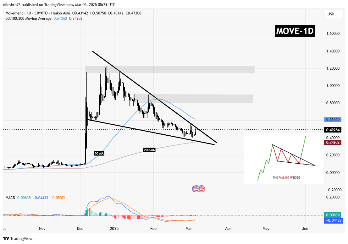 On the daily chart, MOVE is currently trading within a falling wedge pattern, a formation that often signals a potential bullish breakout. The token recently bounced off key support at $0.35, which aligns with the 200-day Moving Average (MA). This rebound has pushed MOVE toward the upper resistance of the wedge, where it is now trading at $0.49.