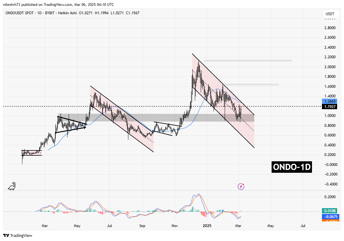 On the daily chart, ONDO has been trading within a descending channel pattern following its recent all-time high. The token recently bounced off key support at $0.88 and has now climbed to $1.19, where it is testing the descending resistance.