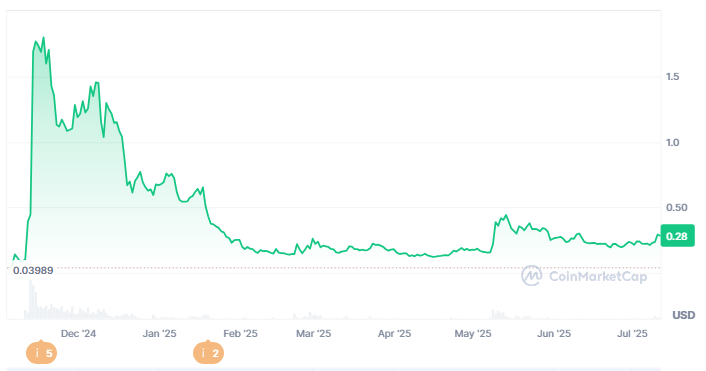 Peanut the Squirrel didn’t just scamper into the meme coin scene, it sprinted in, dragging a bag of rocket fuel. With a current price of $0.2799 and a market cap closing in on $280 million, it’s clear that PNUT found viral traction. The coin’s wildest brag? A 447,000%+ climb from its all-time low of $0.03396 in November 2024 to an ATH of $2.47 just nine days later. Even squirrels are shocked.