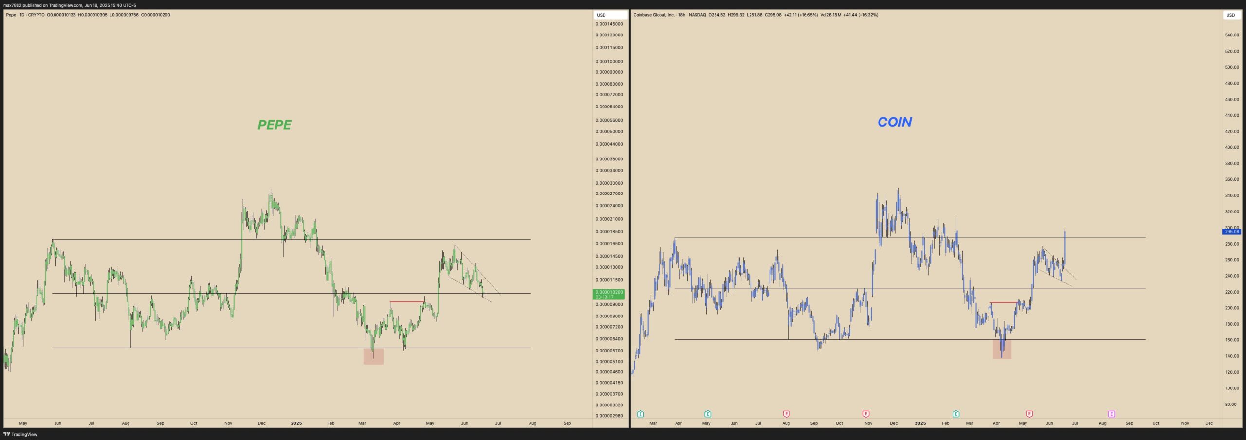 A comparative chart by Max highlights a notable similarity between PEPE’s current structure and COIN’s previous price action. In the COIN chart, the stock formed a clean falling wedge, followed by a bullish breakout that triggered a major upside rally.