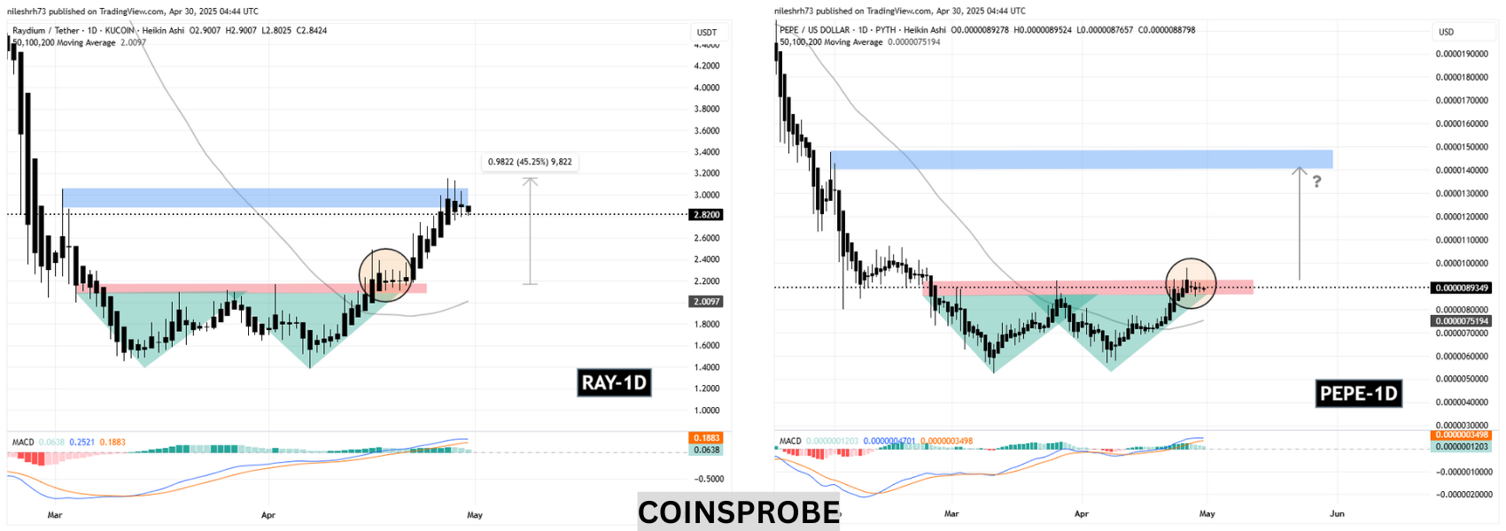 The chart comparison between Raydium (RAY) and PEPE paints an intriguing picture. On the left side, RAY shows a classic double bottom breakout, with the neckline around $2.16. After a clean retest of this zone, RAY launched into a 45% rally, validating the strength of the pattern.