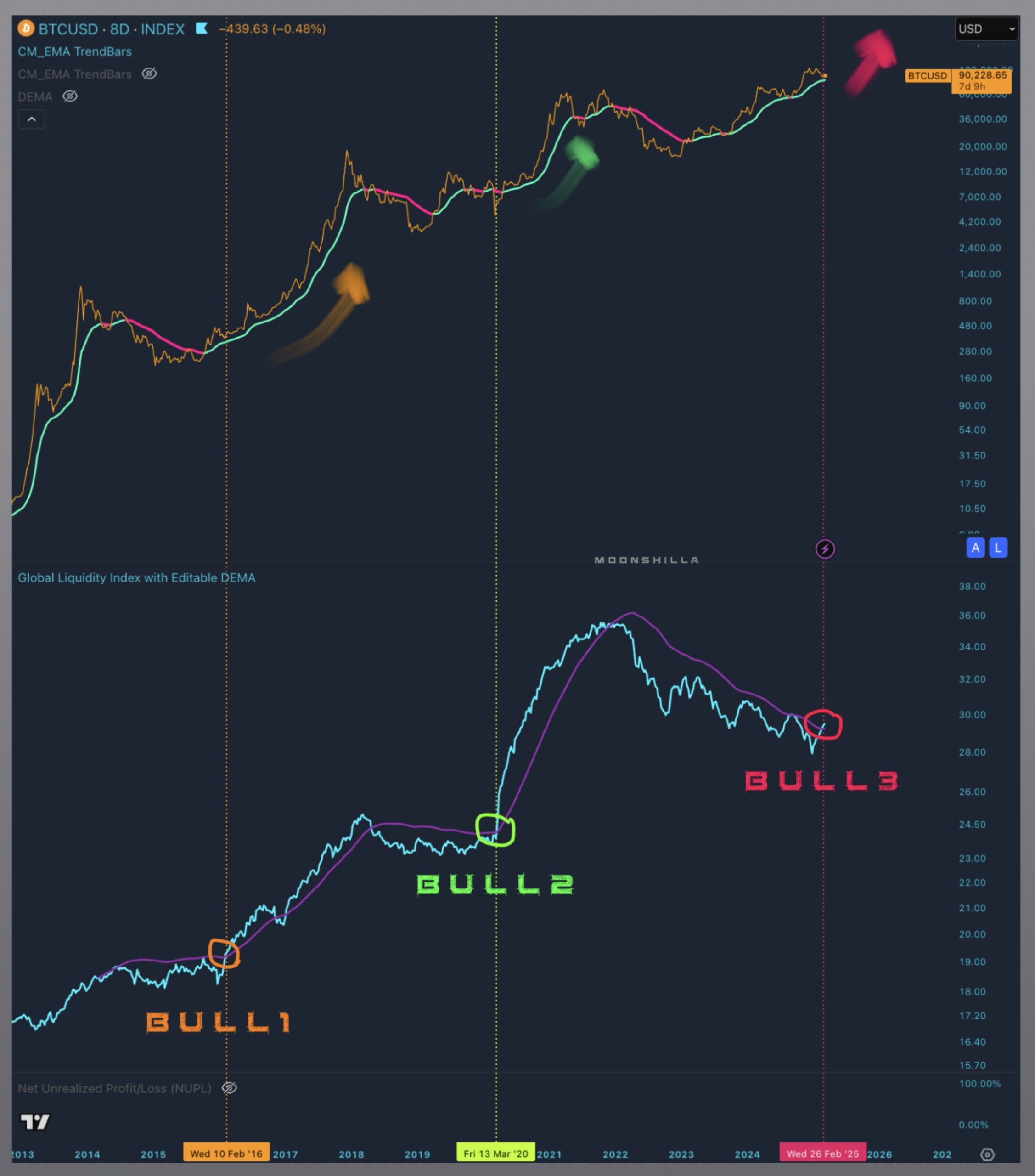 While market conditions remain uncertain, analyst Chandler has also referenced insights from @Moonshilla, highlighting the significance of the Global Money Supply (M2) crossing the 100 DEMA (Double Exponential Moving Average). Historically, this event has coincided with major Bitcoin rallies.