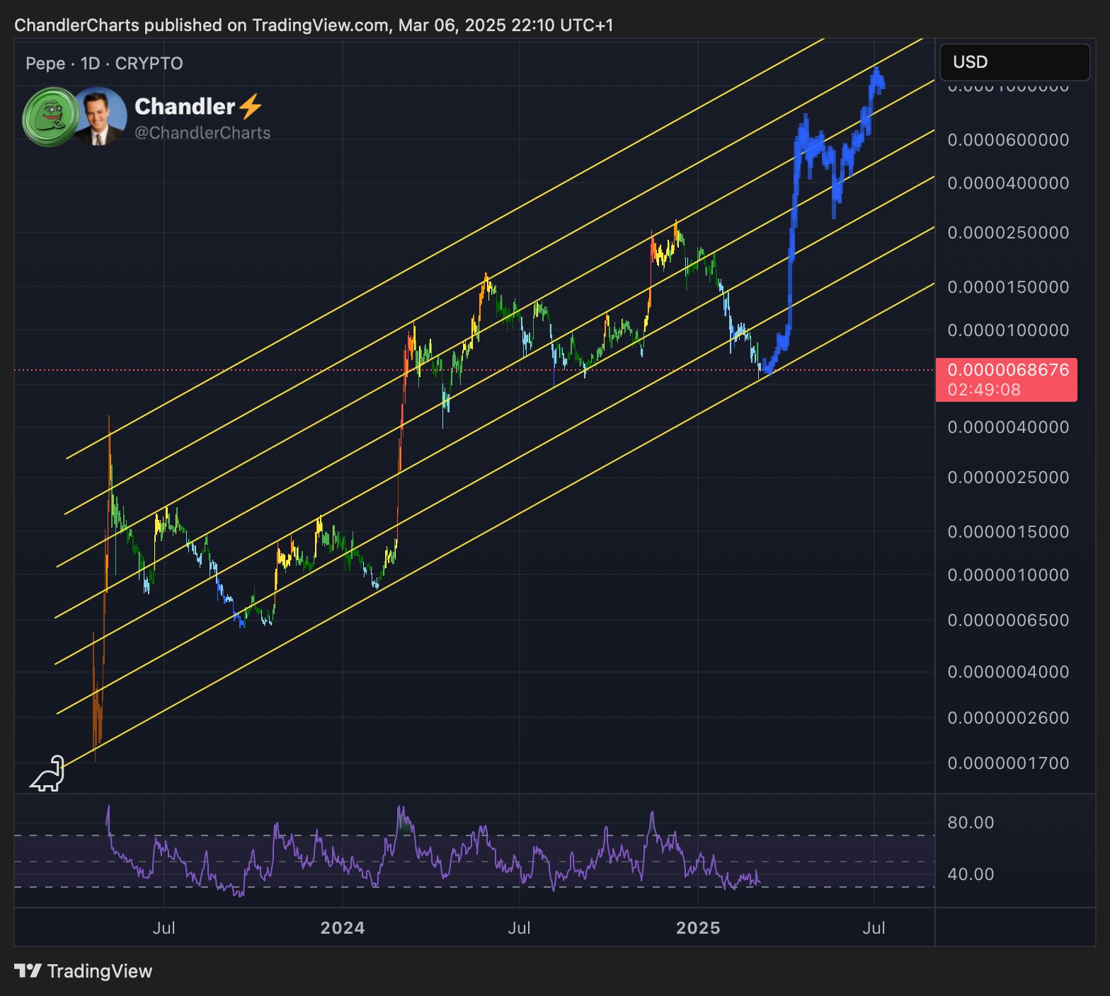 According to the latest analysis by crypto analyst Chandler, PEPE has now reached a critical Make or Break Support level. Since its December 9 high of $0.000028, the price has continuously declined, bringing it down to the $0.0000068 mark, where it is now testing a crucial trendline support.