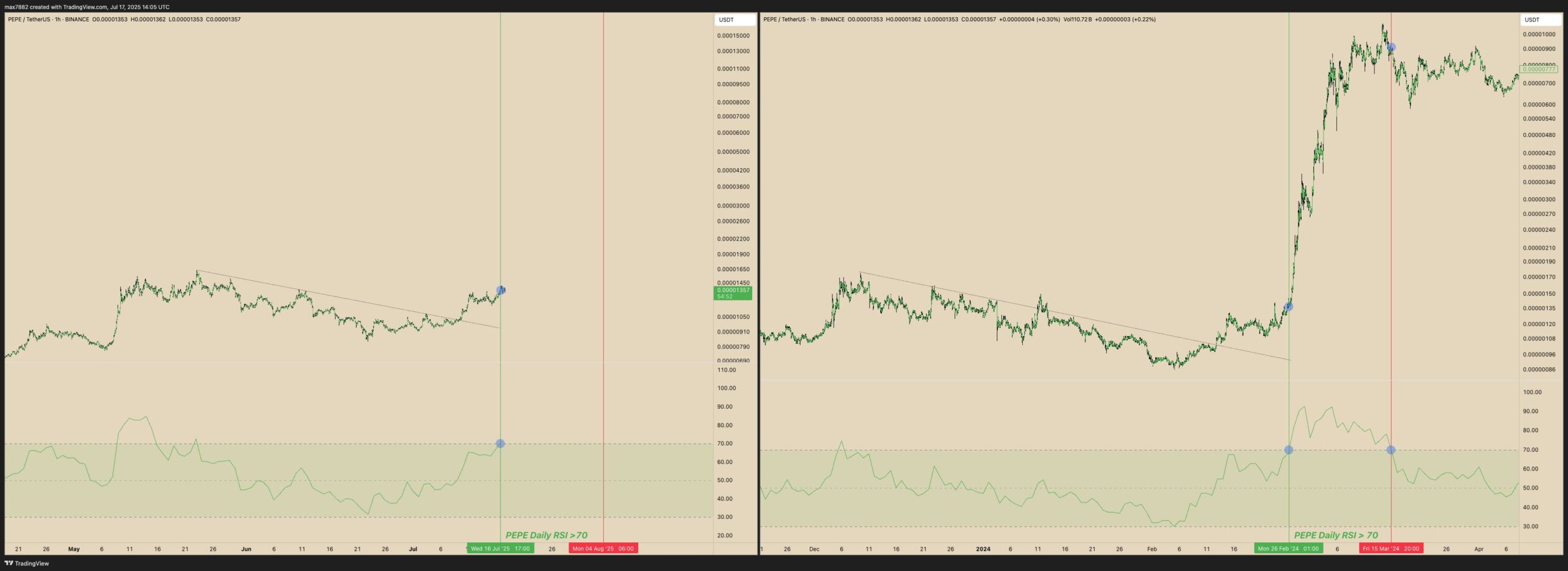 Fast forward to now: PEPE has once again broken out from a descending trendline, and its daily RSI is back above the 70 level—an almost identical setup. This fractal alignment suggests the memecoin might be on the verge of another powerful leg higher.