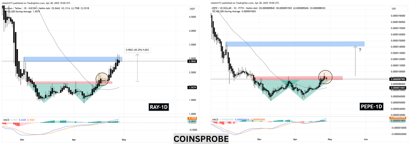 Now, if we look at the right side of the chart, Pepe (PEPE) seems to be following almost the exact same pattern. PEPE has broken out from its double bottom neckline at approximately $0.0000092 and is currently in the process of retesting this level — very similar to what RAY did before its big move upward.