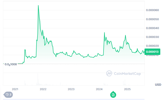 Shiba Inu is trading at $0.00001341 with a market cap of $7.9 billion and daily volume of $257.71 million. Over the past 24 hours, it has climbed 2.76%, while the past week delivered a 12.16% gain. Monthly movement sits nearly flat at 0.04%, and its one-year chart still reflects a 2.91% decline. Yet the long-term picture remains astonishing, with a lifetime gain exceeding 1,005,590% from its September 2020 all-time low of $0.00000000008165 to the $0.00008845 peak in October 2021.