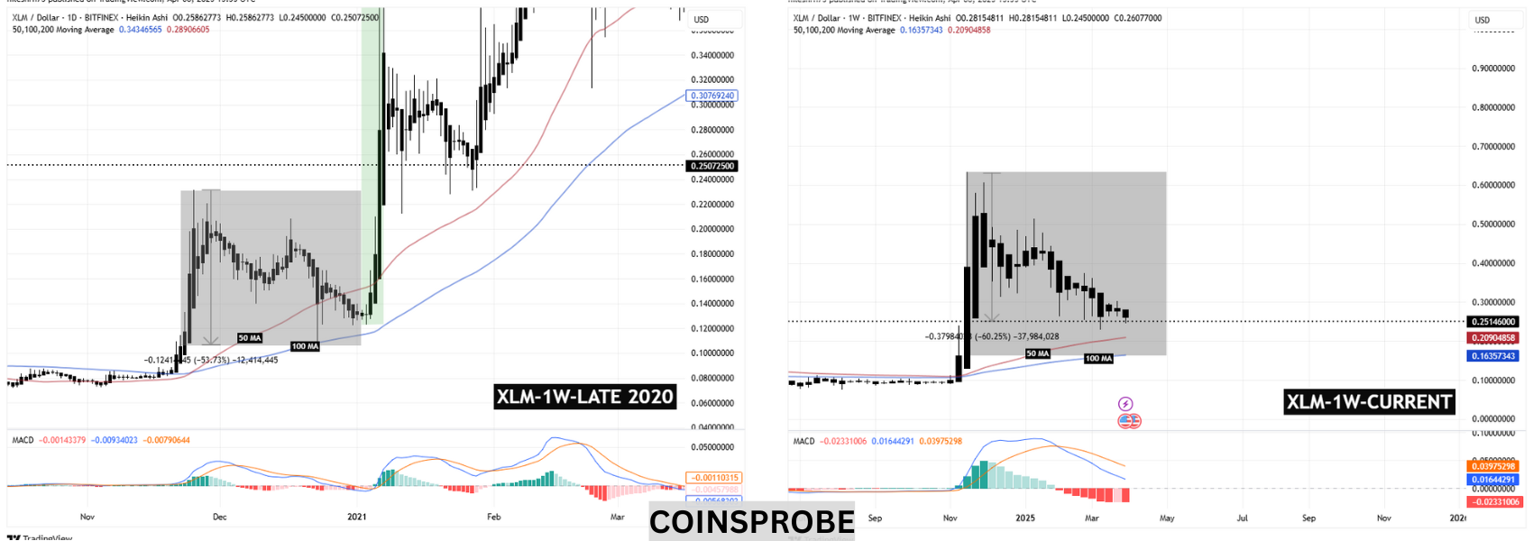 The current setup looks eerily familiar. The token is hovering above both the 50 and 100 MAs, just like it did back then. The MACD is also starting to round off at the bottom, a technical signal that previously preceded XLM’s breakout. The histogram is slowly losing bearish momentum—similar to what was observed before the 2021 reversal.