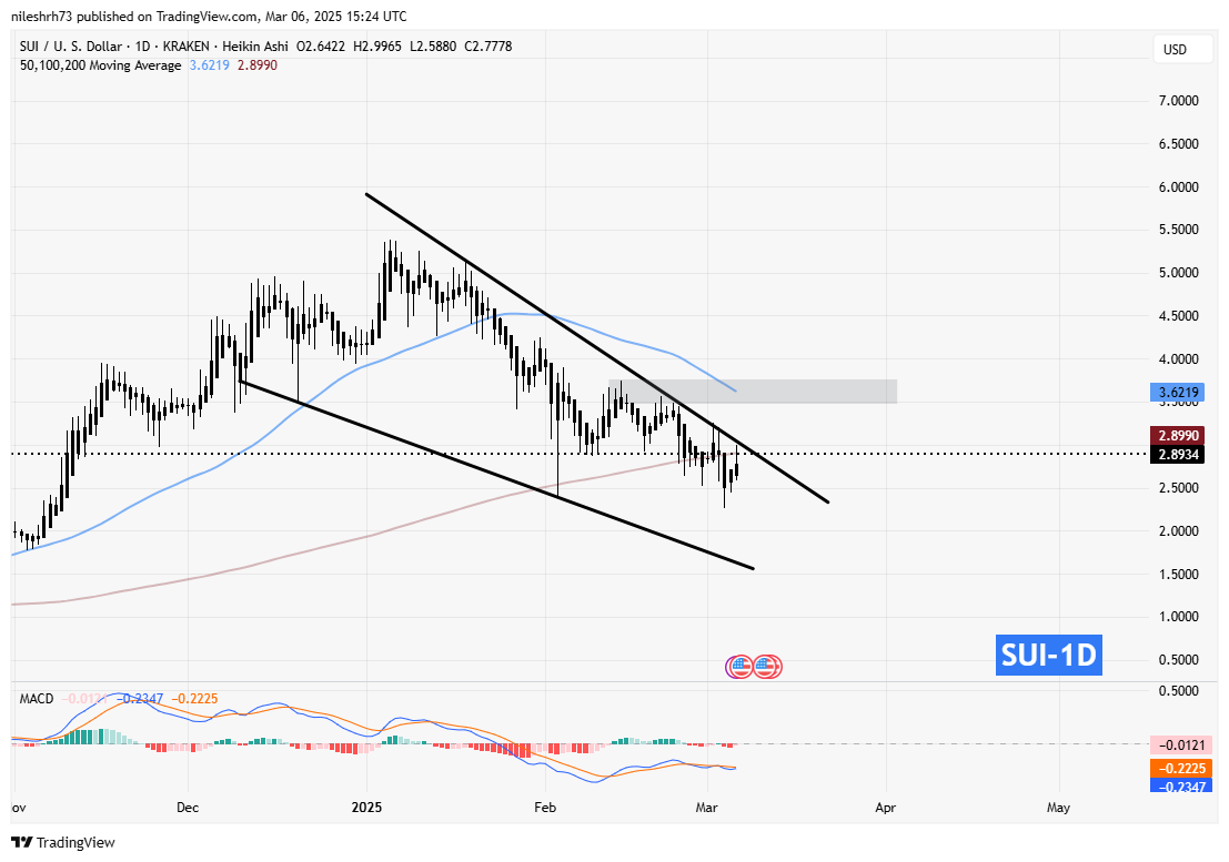 From a technical perspective, SUI is approaching a critical breakout level. Following the partnership news, the token jumped to $2.89, bringing it closer to the upper resistance of its falling wedge pattern while also testing the 200-day moving average (200MA).
