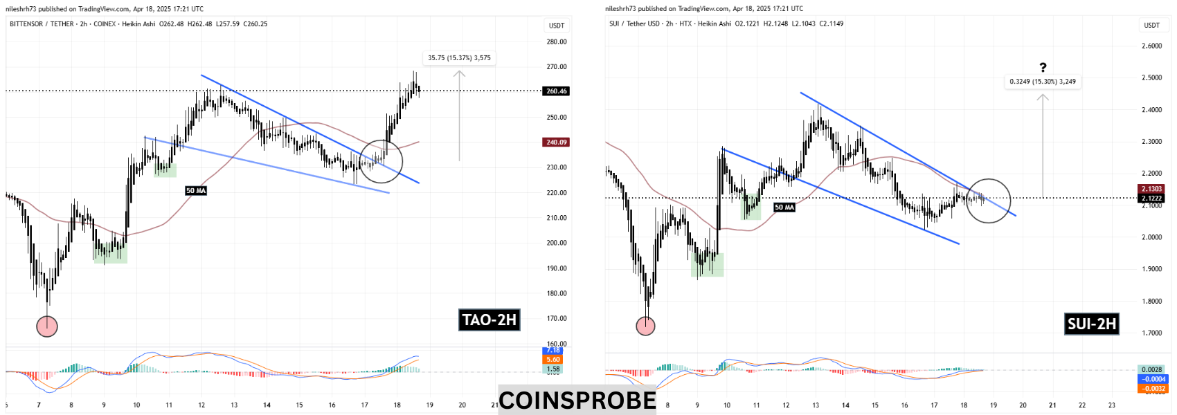 Looking at the charts side-by-side, TAO recently broke out of a falling wedge pattern on the 2-hour timeframe, surging nearly 15% shortly after reclaiming its 50-period moving average. The move was clean, confirmed with strong bullish candles and backed by an uptick in MACD momentum.