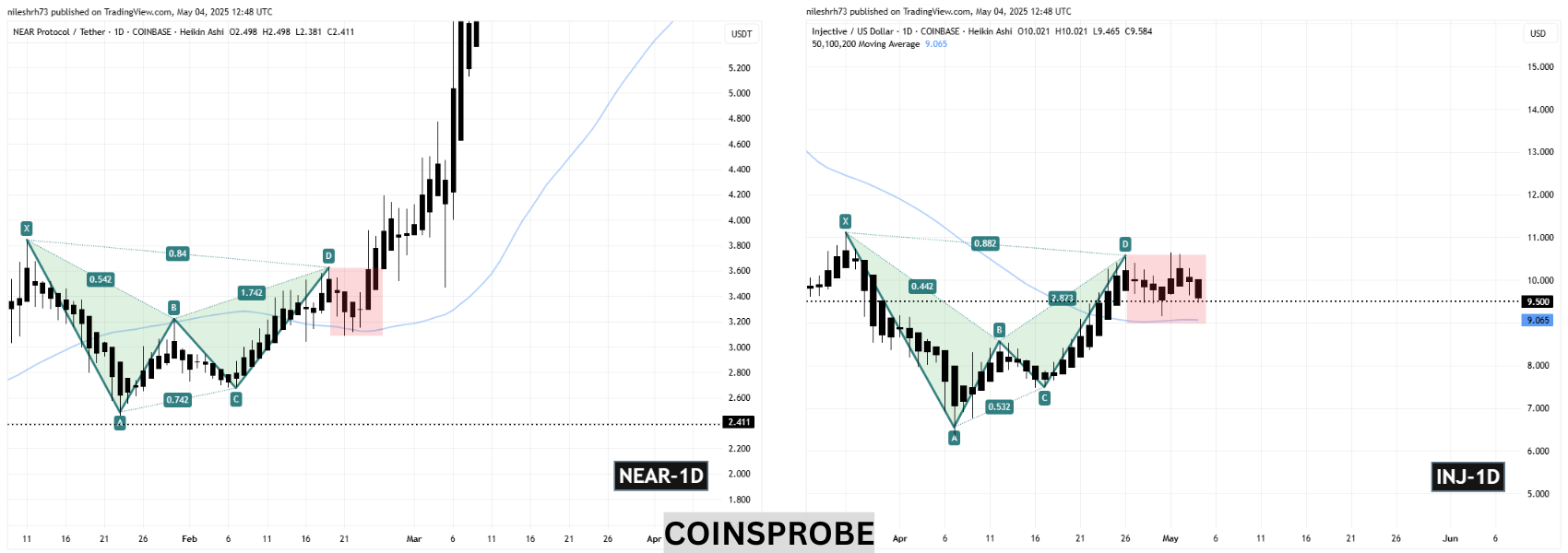 Now, on the right, we see Injective (INJ) showing strikingly similar price action. The same bearish Gartley pattern has completed, and INJ is currently pulling back from its point D — again, finding support near its 50-day moving average (currently around $9.06).